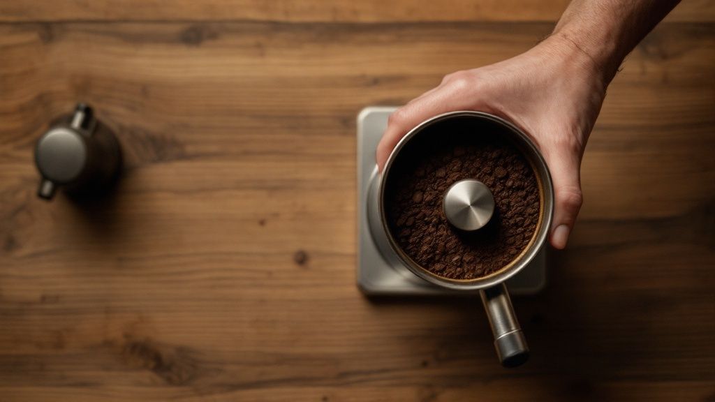 Once your grind is dialled in, it’s time to tamp. The goal here isn't to press down as hard as you can. It's all about consistent, level pressure that compacts the grounds into a flat, even puck. An uneven tamp is one of the main reasons for channelling, where water finds the easiest path through and bypasses most of the coffee.