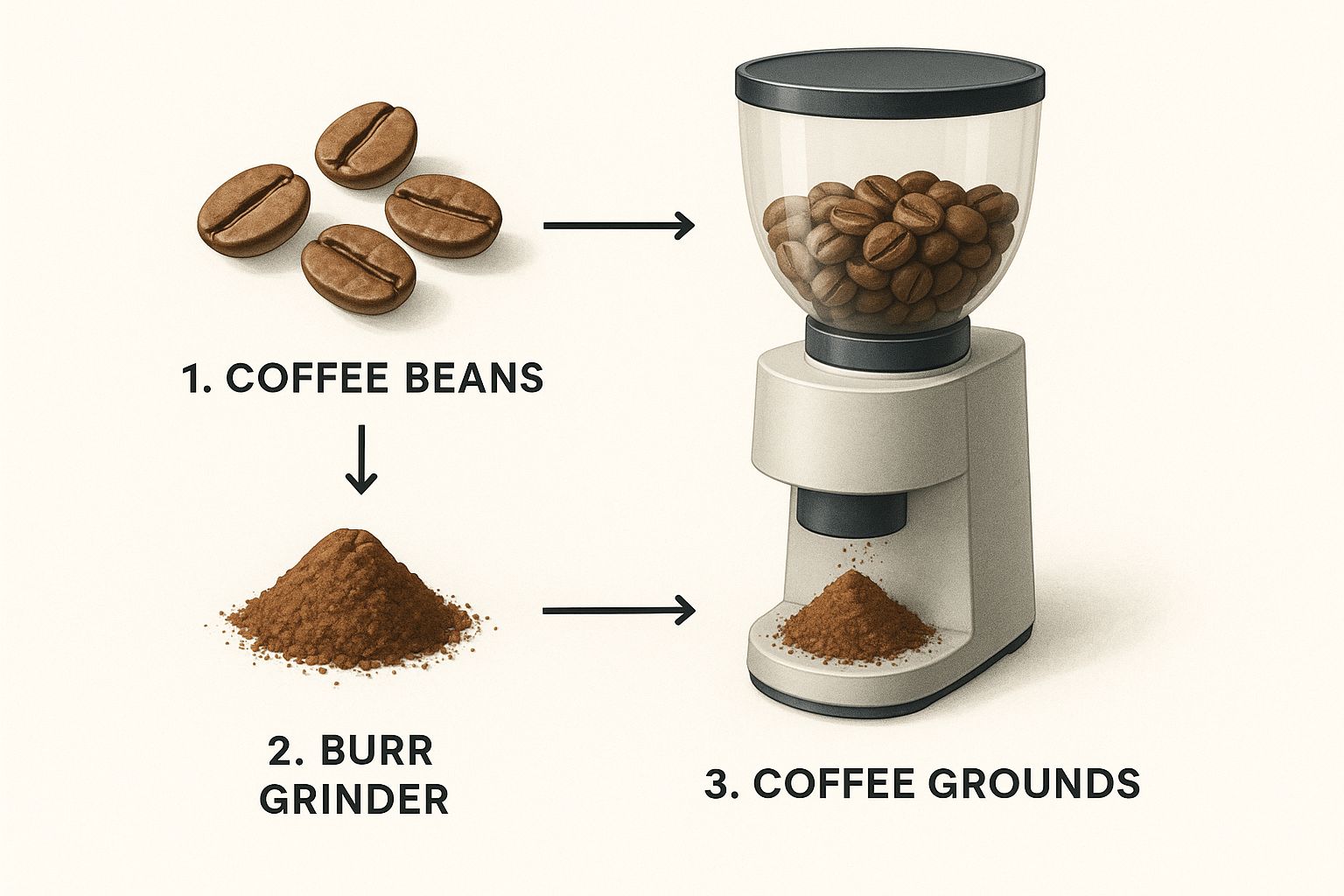This image breaks down the journey from a whole bean to a perfectly prepared puck of coffee, ready to go.